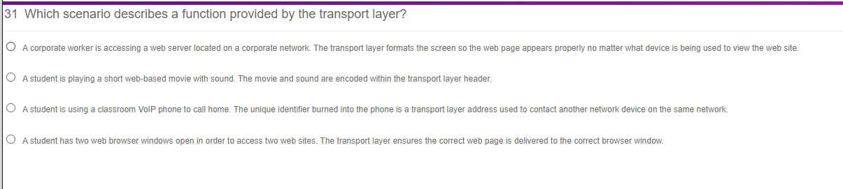 . Which scenario describes a function provided by the transport layer. Which scenario describes a function provided by the transport layer. O A student is using a classroom VoIP phone to call home.